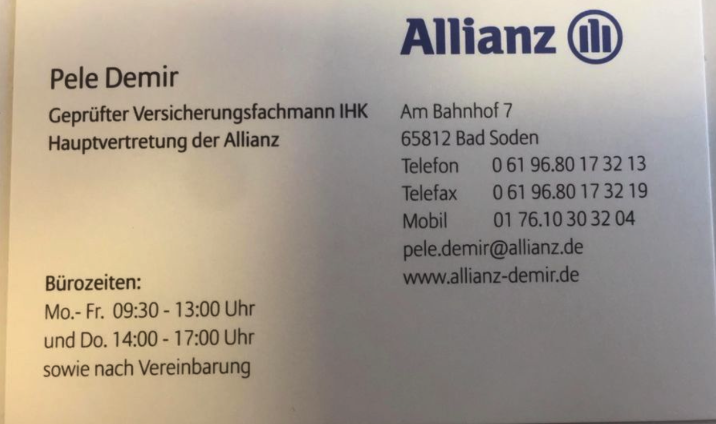 061 96.80 17 32 13 01 76.10 30 32 04 https://vertretung.allianz.de/pele.demir/ pele.demir@allianz.de Am Bahnof 7